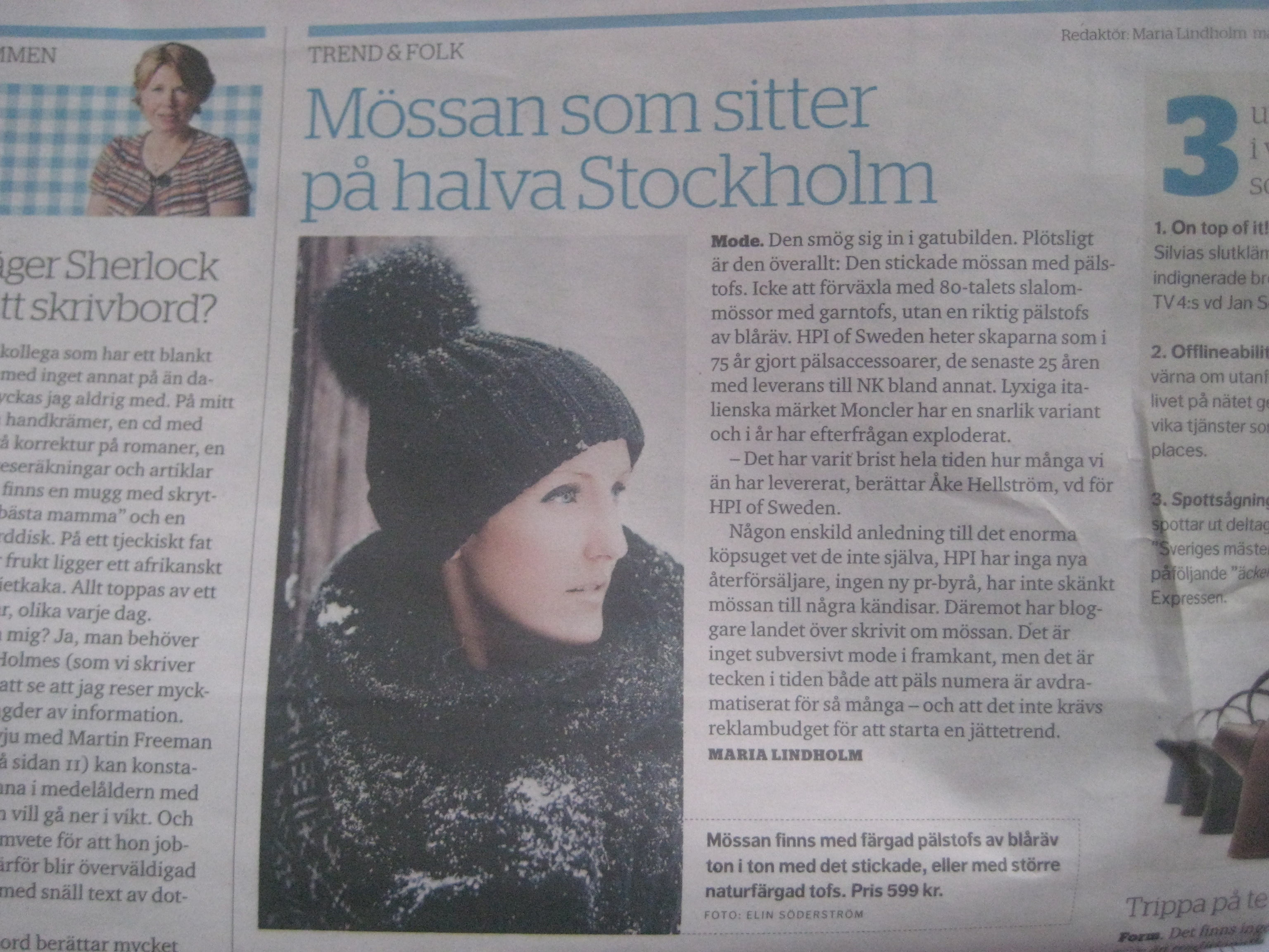 Vidare i texten, citat Maria Lindholm: ”Det är inget suversivt mode i framkant, men det är tecken i tiden både att päls numera är avdramatiserat för så många – och att det inte krävs reklambudget för att starta en jättetrend.”
