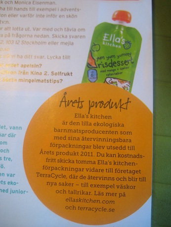 ”Ella´s kitchen är den lilla ekologiska barnmatsproducenten som med sina återvinningsbara förpackningar blev utsedd till Årets produkt 2011. Du kan kostnadsfritt skicka tomma Ella´s kitchenförpackningar vidare till företaget TerraCycle, där de återvinns och blir till nya saker – till exempel väskor och tallrikar. Läs mer på ellaskitchen.com och terracycle.se”