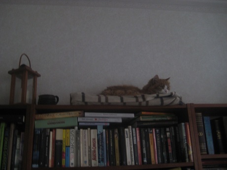 Idéer och initiativ kan mina katter ta stundtals. Här om dagen lyckades Wilma med det hon försökt länge. Ta Currys plats högt uppe på bokhyllan!