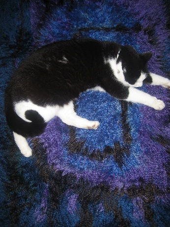 Ensamkatten Felix delar helst inte med sig av någonting! Här softar han på den gamla ryamattan som min farmor Svea knutit en gång för länge sen.