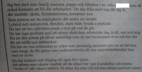Det handlar om en utlyst tjänst om personlig assistent, timvikarie till en liten pojke med funktionshinder. I annonsen framgår att assistenten får pojkens hem som arbetsplats men ska även följa med till pojkens skola och kompisar.